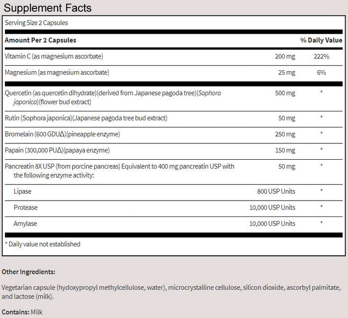 - Bromelain, papain, and pancreatin provide a mixture of protein-specific and other enzymes that help ensure proper breakdown of protein molecules that may otherwise cause irritation.† Vitamin C, buffered with magnesium to eliminate acidity, supports histamine metabolism, detoxification processes, and collagen synthesis.†